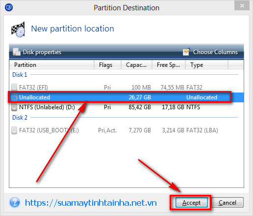 Bước 8: Bấm chuột chọn vào phân vùng trống như hình bên dưới rồi bấm vào nút Accept.